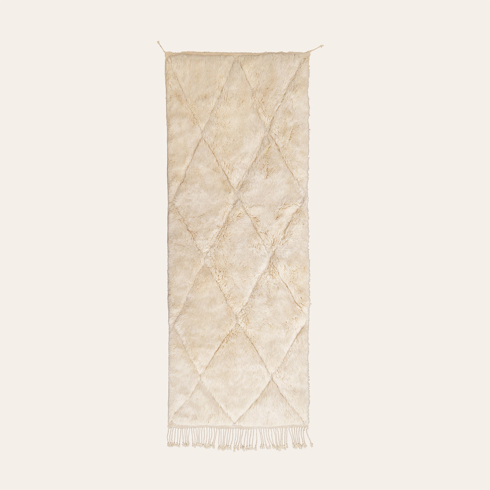 Voor de WOOL collectie konden we het niet laten om een traditioneel motief opnieuw vorm te geven in puur onbewerkt wol, geïnspireerd door het klassieke Beni Ourain ontwerp die een hoofdrol hebben gespeeld in de blijvende populariteit van Berberse tapijten. Het diamanten motief symboliseert bescherming en een diepe verbinding met de natuur. De diamantvormen creëren niet alleen een sterke visuele aantrekkingskracht, maar vertegenwoordigen ook een historische cultuur, waardoor dit stuk een prachtige én betekenisvolle klassieker is voor jouw ruimte. Origineler én stijlvoller wordt het niet.