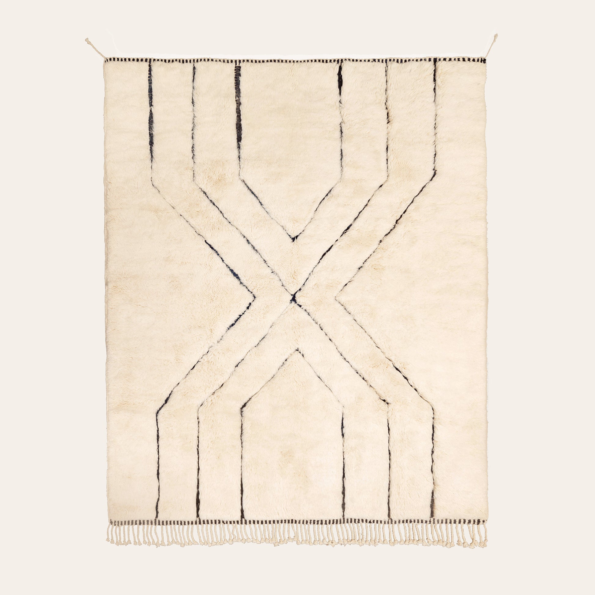 In het ASIF tapijt ontdek je de schoonheid van symmetrie en verbinding. De zuiver witte pool wordt onderbroken door zwarte lijnen die in balans samenkomen, een abstracte reflectie van de harmonieuze samenvloeiing van twee kruisende paden. Dit contrastrijke tapijt legt zo de meest sierlijke bewegingen van de natuur vast met haar verweven lijnen en geeft je ruimte een gevoel van rust en continuïteit.