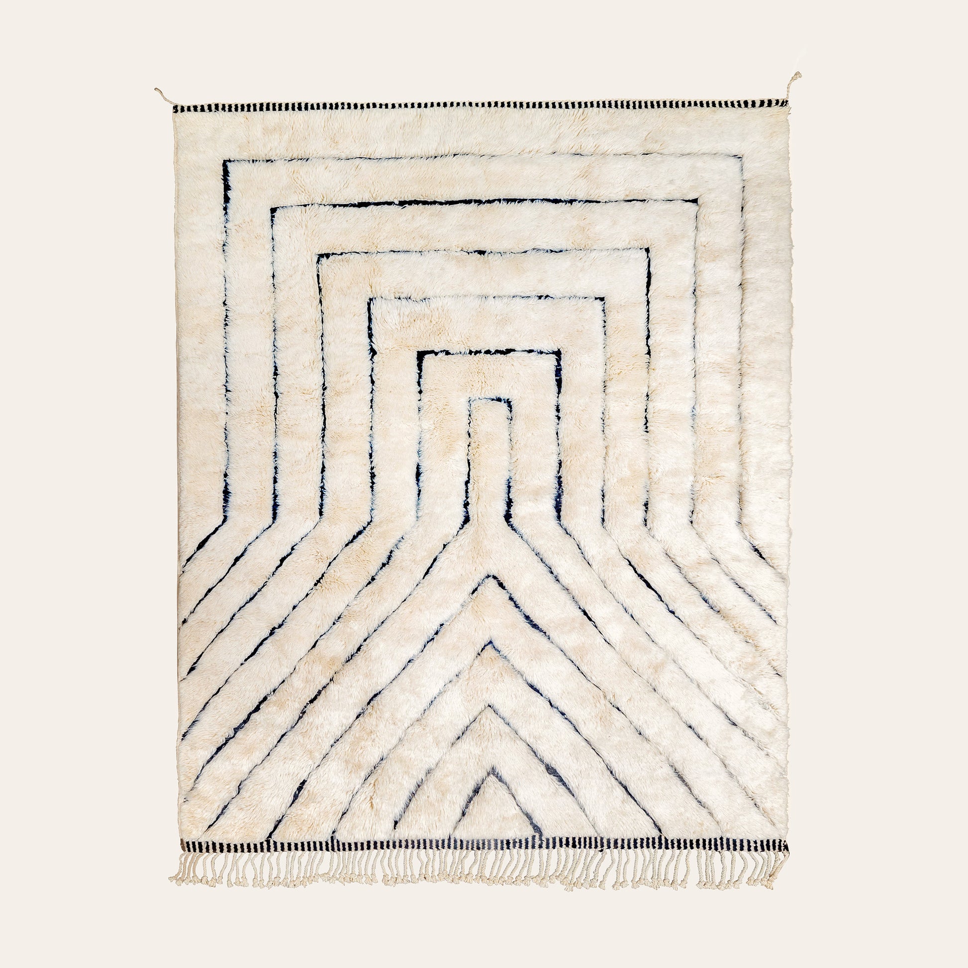 Franjes zijn een kenmerkend detail van Berberse tapijten en worden meestal aan één uiteinde van het kleed gevlochten. Heb je liever een strakke afwerking zonder franjes? Geen enkel probleem. Wij maken ook vloerkleden zonder franjes.