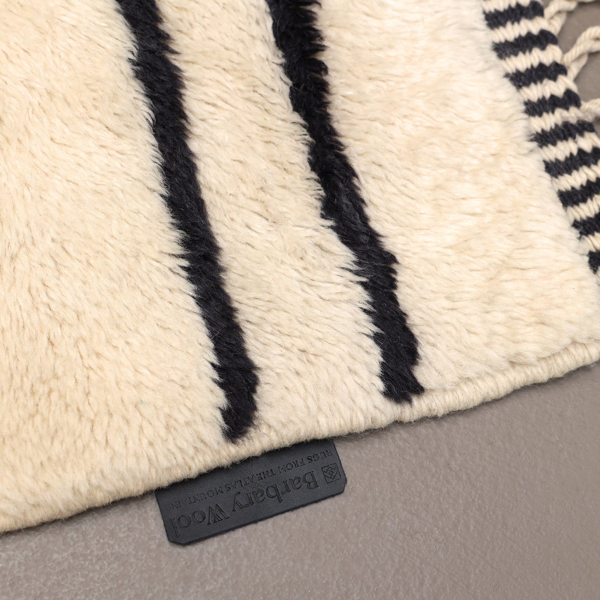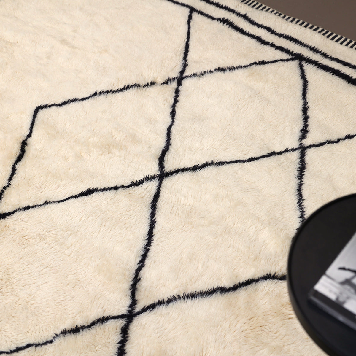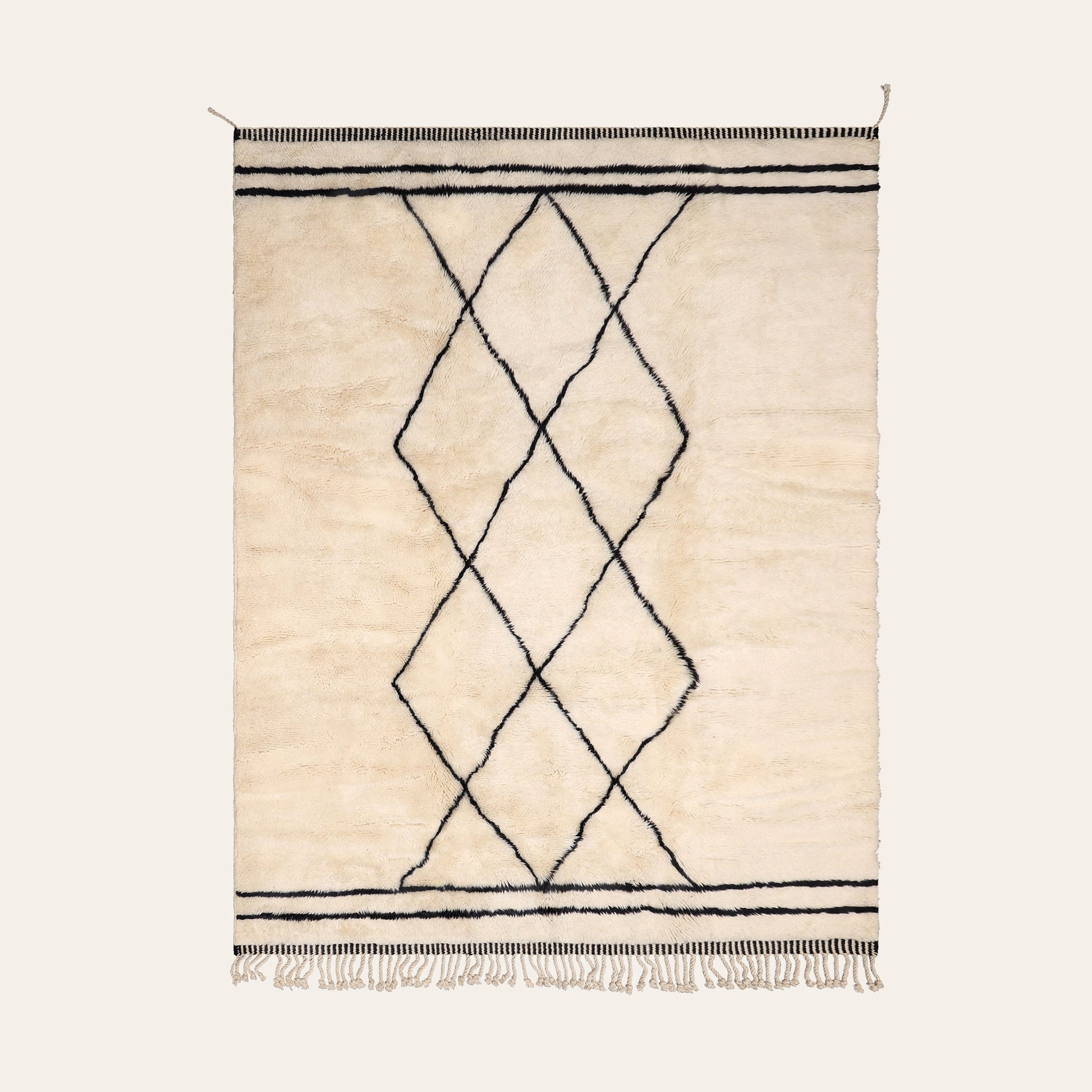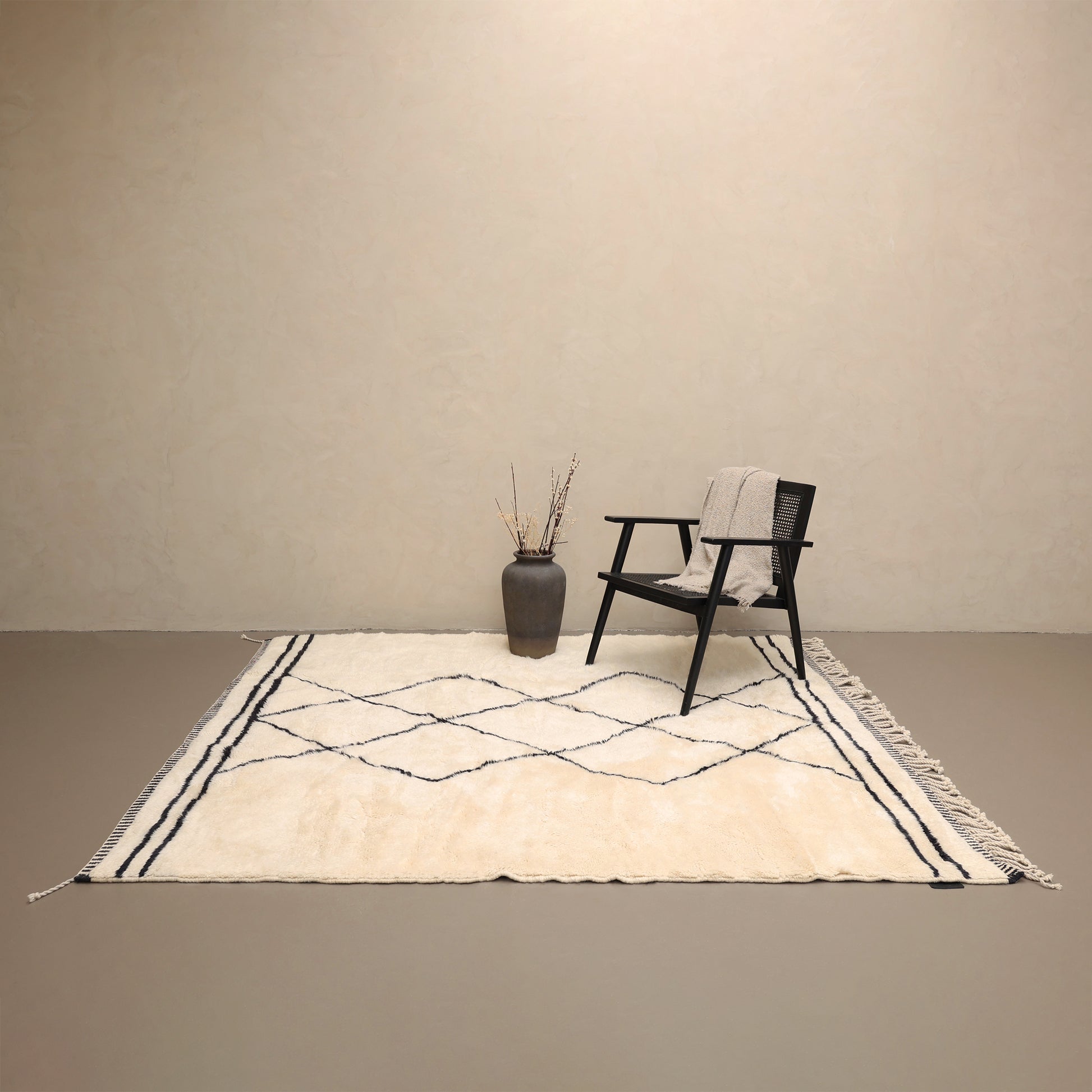 Beni Ouarain Modern is een moderne interpretatie van de klassieke Beni Ouarain vloerkleden. Volledig met de hand geweven van zachte schapenwol, wordt het herkenbare ruitpatroon in het midden van dit vloerkleed omlijst door twee krachtige horizontale lijnen aan beide uiteinden. Organisch van vorm en modern van geest.