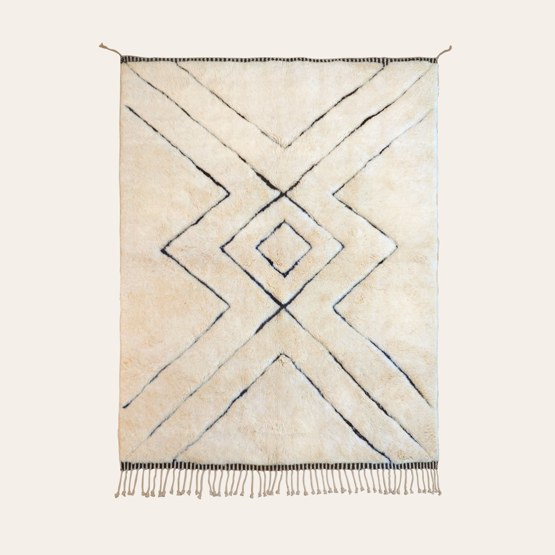 Dit diamantvormige ontwerp staat centraal in de Berberse symboliek – de echte 'ster' van de show. Een tijdloos motief dat de schittering van de Berberse tapijttradities weerspiegelt, eenvoudig maar indrukwekkend. Scherpe zwarte lijnen snijden elegant door een zachte witte pool, waardoor een stuk ontstaat dat moeiteloos een authentieke en inheemse touch toevoegt aan elk interieur.