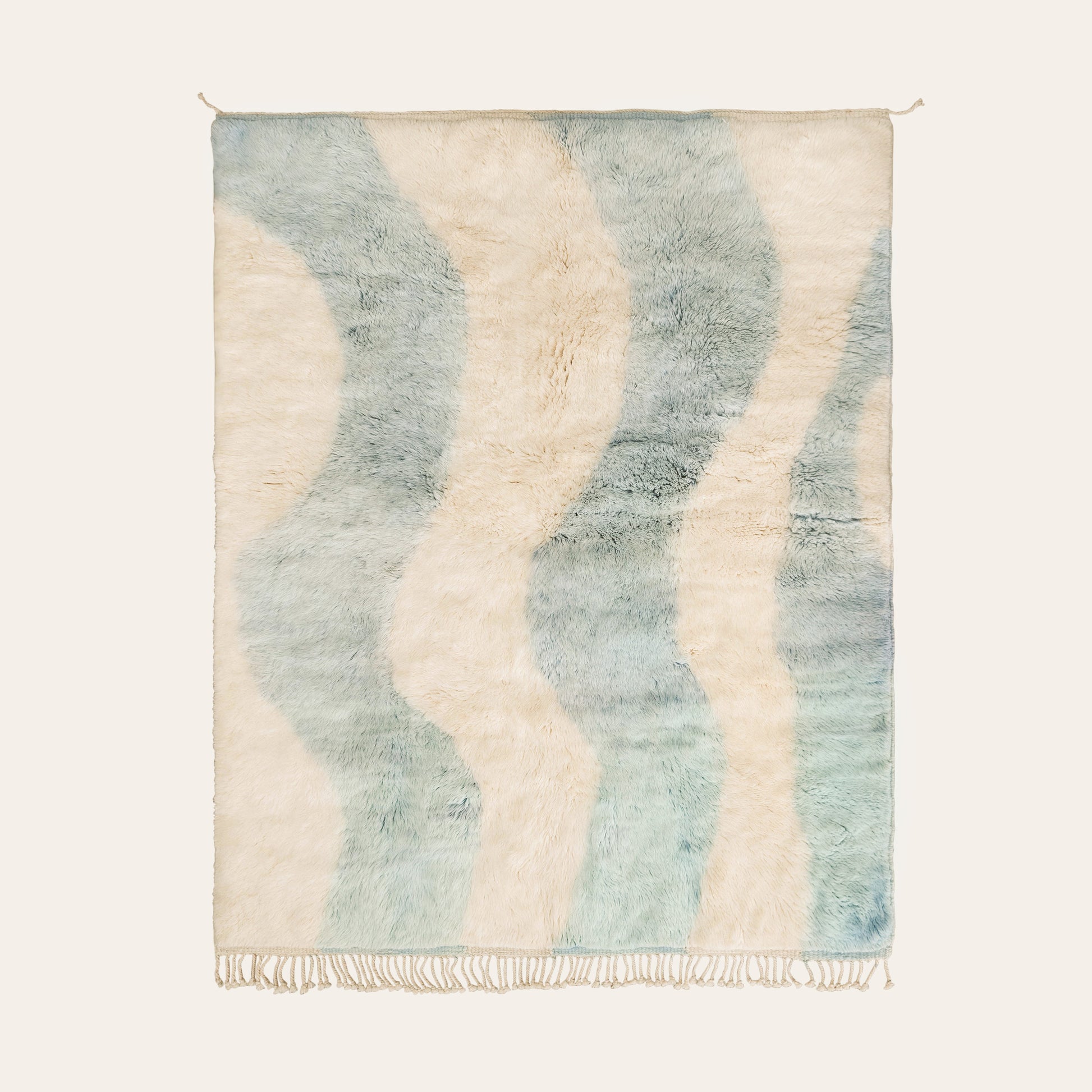 Laat je onderdompelen in de kalmerende schoonheid van dit Berberse tapijt. De drie golvende strepen symboliseren het tijdloze ritme van oceaangolven. Het blauw, met zijn verfijnde zachte tint en subtiele verloop, voegt diepte en een vloeiend gevoel toe aan het ontwerp. Dit tapijt roept de constante kalmte en rustgevende energie van water op en creëert een serene en harmonieuze sfeer in elke ruimte.