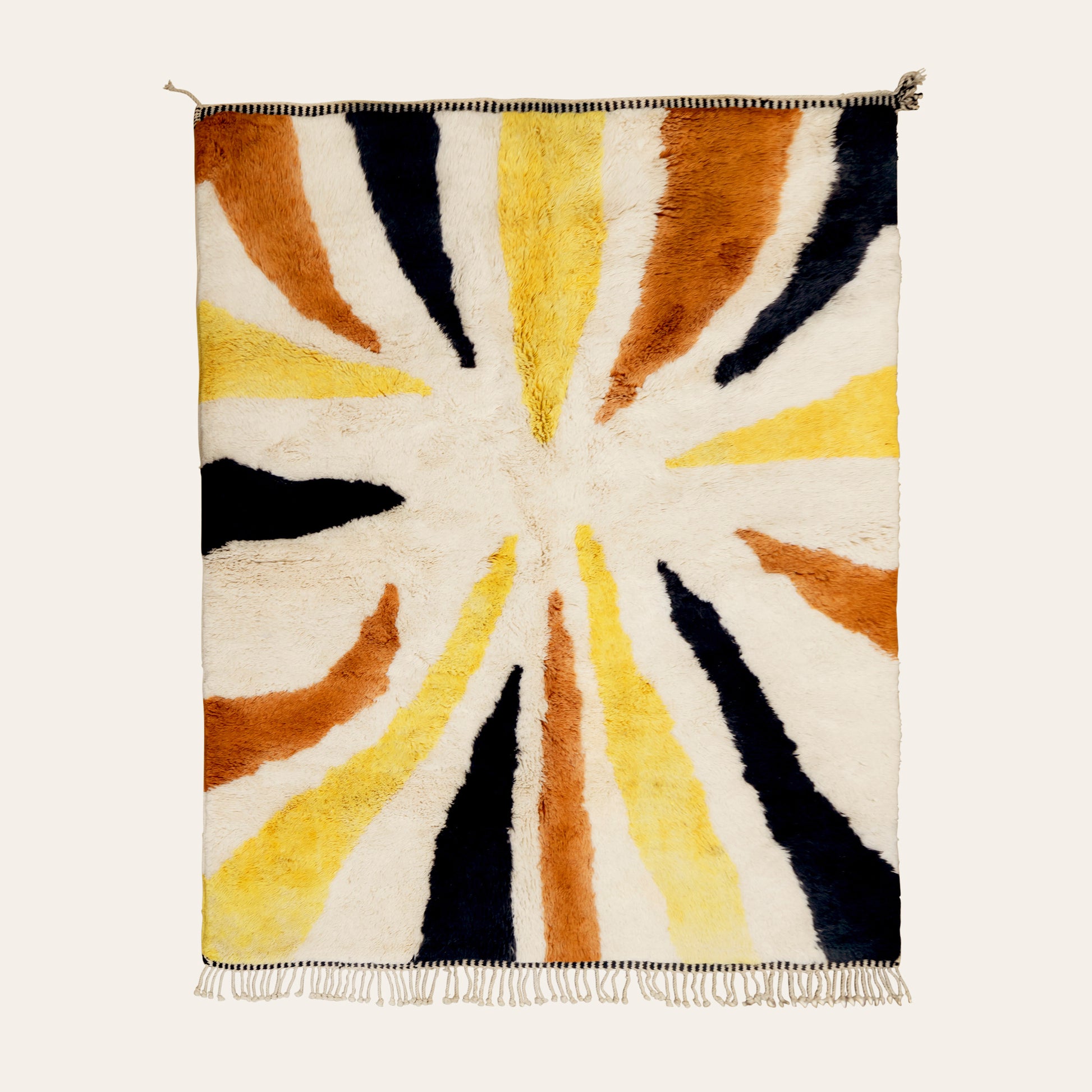 Vernoemd naar het Arabische woord voor ‘licht’, straalt dit Berberse tapijt warmte en harmonie uit. Het zonvormige cirkelmotief, uitgevoerd in kleuren Onyx Zwart, Honingbruin en Zonneschijn, brengt een gevoel van rust en evenwicht.