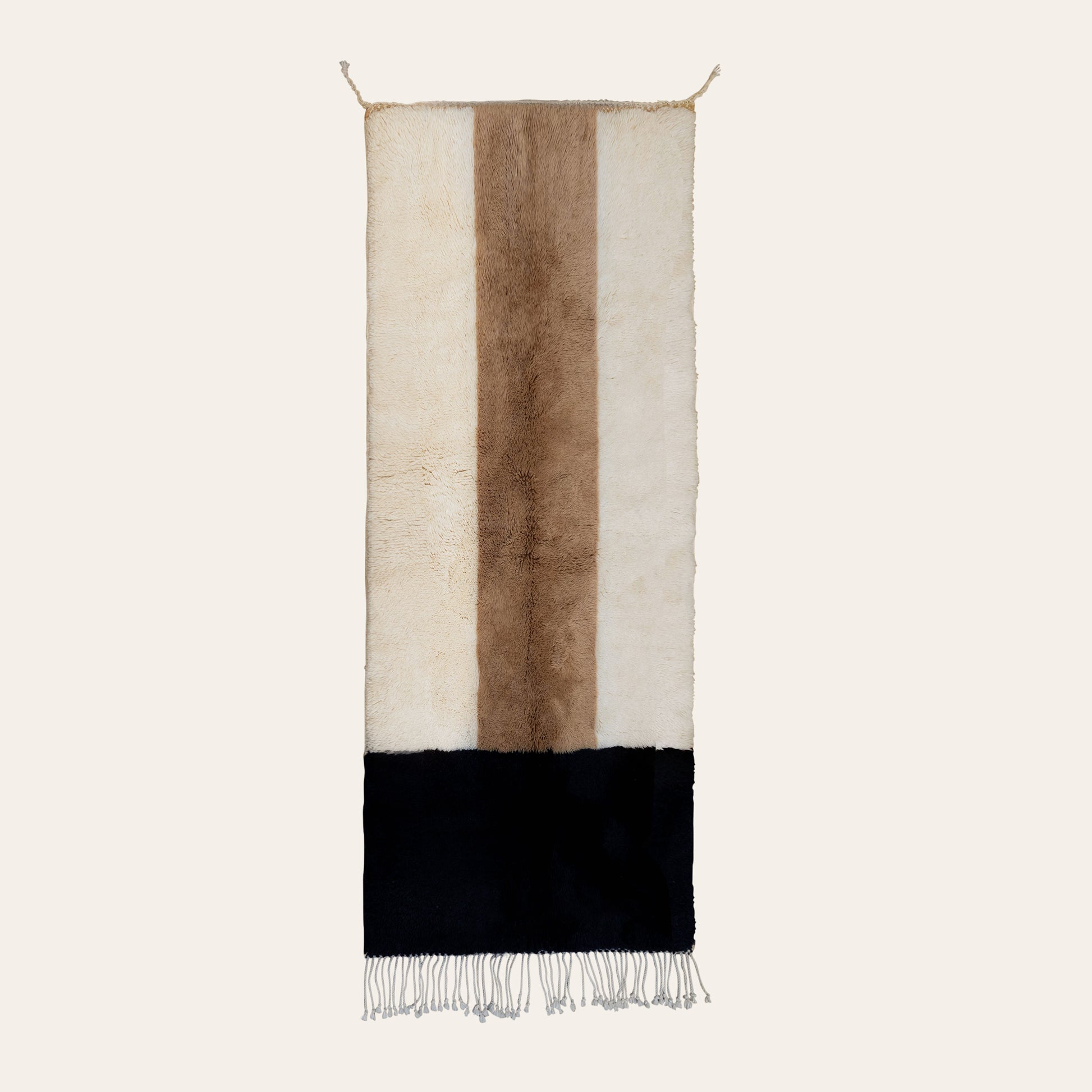 Het Numidia tapijt is een knipoog naar de historisch glorieuze Amazigh-stam van Noord-Afrika. Met de hand geknoopt van natuurlijke wol, heeft het een elegant ontwerp met een enkele bruine streep in het midden, geaccentueerd door een gedurfde zwarte streep aan het voeteneind. Deze opvallende combinatie van kracht en contrast belichaamt de verfijning van Berberse ambacht. Maak een statement met de unieke uitstraling van dit stijlvolle tapijt.