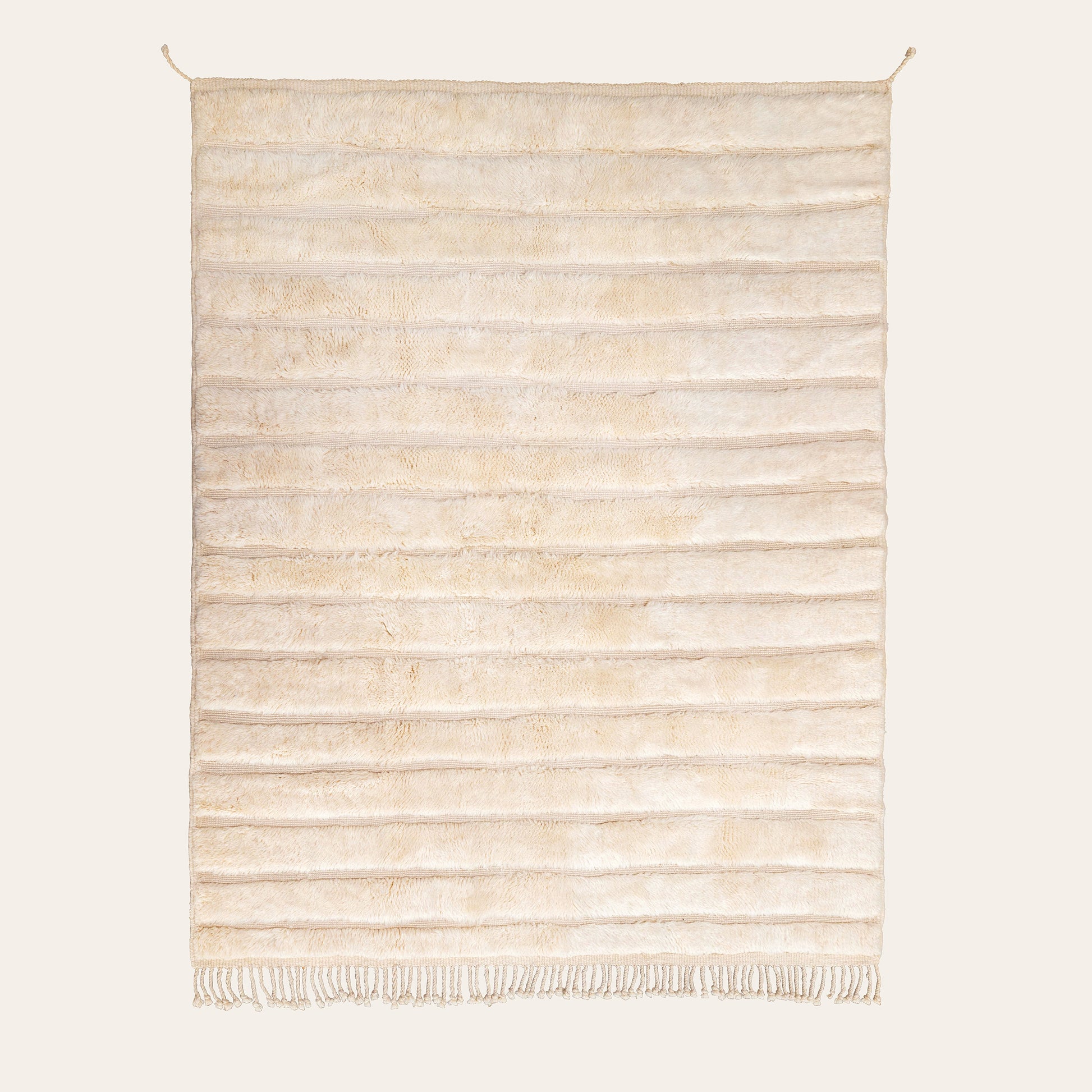 Ivoorwitte wol golft over het hoog-laag ontworpen SAFF "Lijn" tapijt, waar de parallelle lijnen een minimalistisch anker vormen voor elke ruimte die een neutrale ‘feeling’ nodig heeft. Het elegante maar eenvoudige ontwerp is tot stand gekomen door de toepassing van verschillende weeftechnieken, waardoor subtiele lagen van textuur en diepte ontstaan. Een werkelijk onmisbaar stukje kunst voor op de vloer dat belooft de tijd te trotseren.