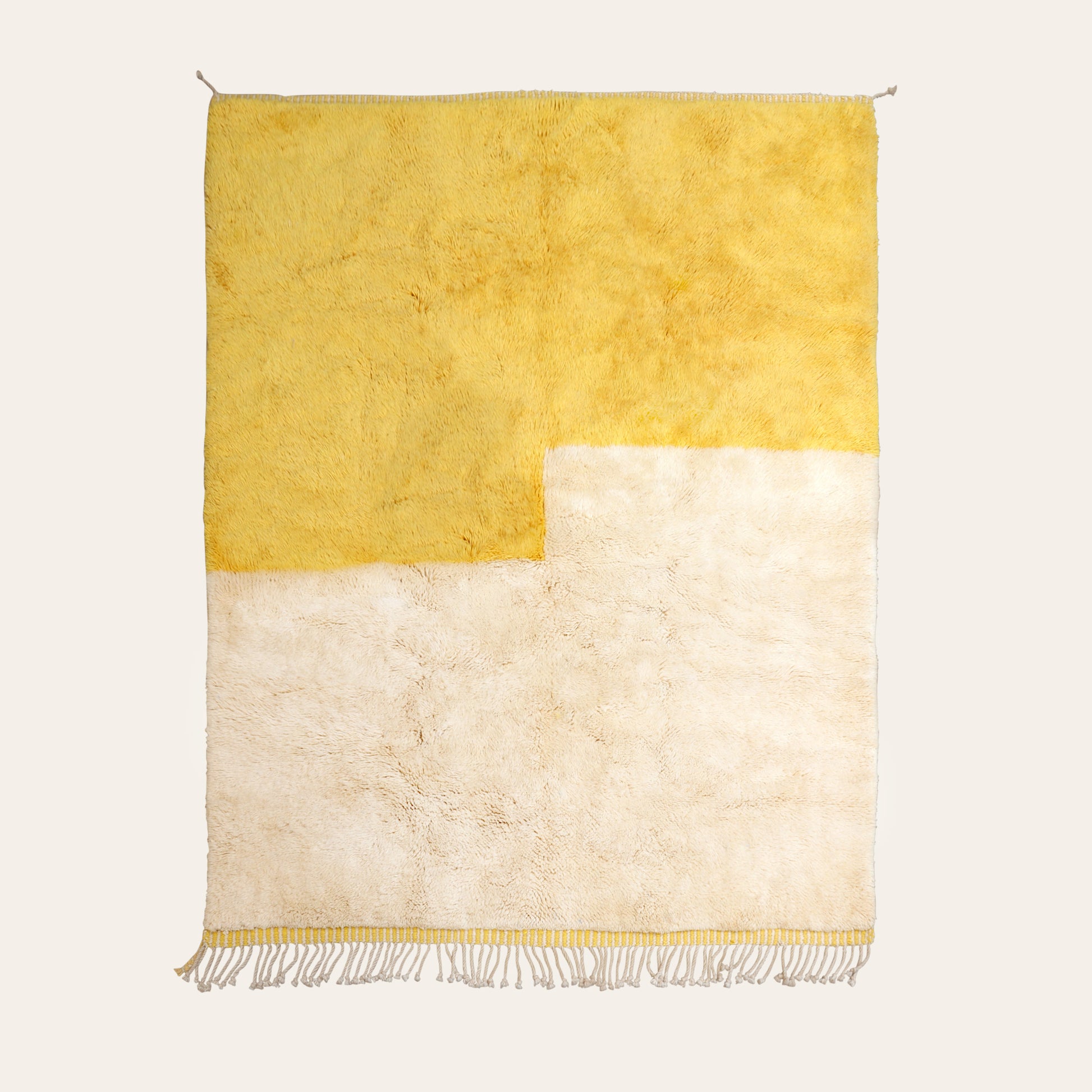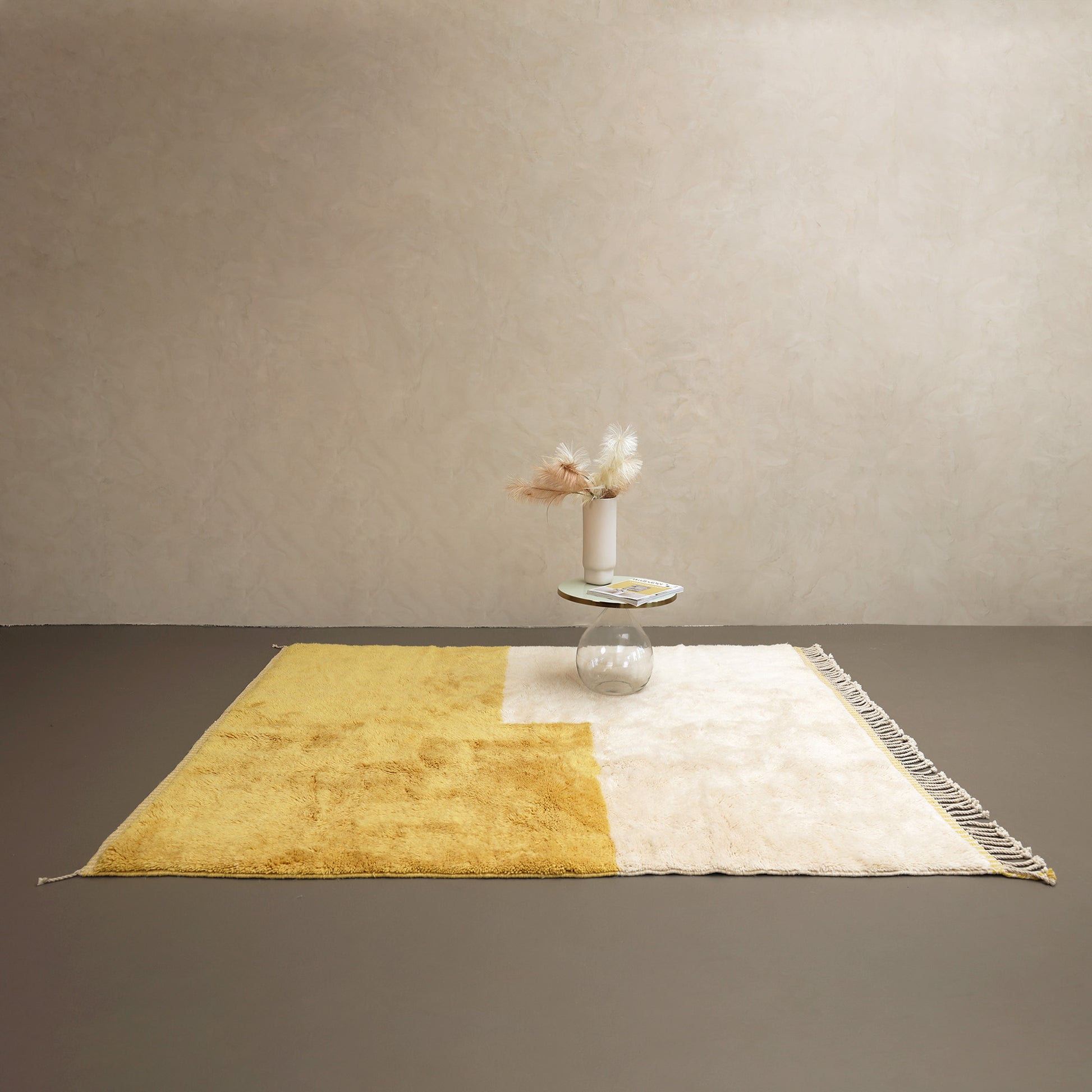 Gemaakt van natuurlijke en zonkleurige wol, is dit half-half Berberse tapijt het perfecte vloerkleed om je ruimte te verlichten. De witte helft brengt een luchtig gevoel terwijl het zonneschijn-achtige gele helft een vrolijke en opbeurende touch toevoegt. Deze dynamische combinatie creëert een verfijnde, maar rustgevende sfeer, ideaal voor wie een vleugje vreugde aan zijn interieur wil toevoegen.